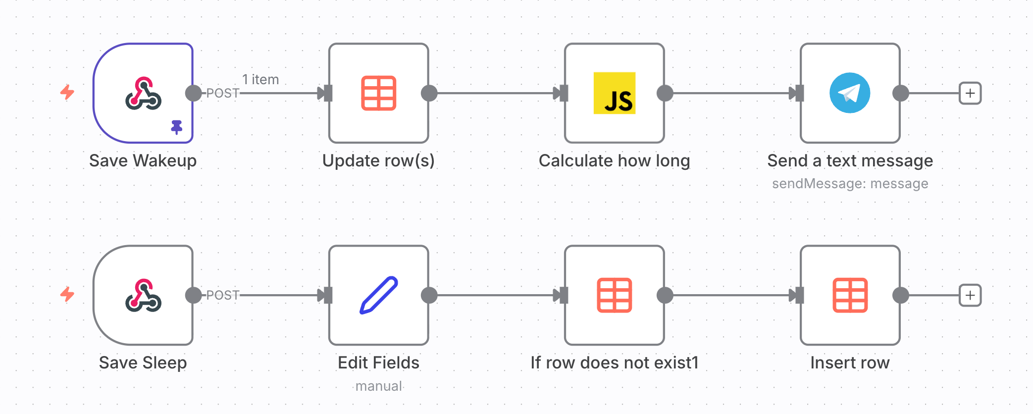 The wake up request just sets the datetime of waking up, as well as stores my sleep score with a little comment. The next thing this n8n workflow does is calculate how long I was asleep and sends this to me via a Telegram bot.